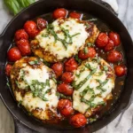 A cozy and comforting meal featuring juicy chicken breasts, fresh basil, creamy mozzarella, and vibrant cherry tomatoes, all cooked in one skillet.