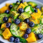 A refreshing summer salad featuring juicy mango, crisp cucumber, creamy avocado, and tart blueberries.